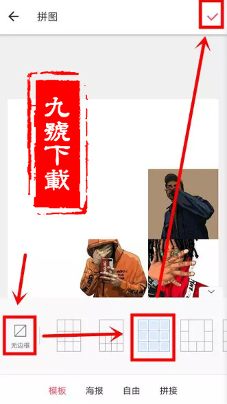 这里记得选择【无边框】的【九宫格】模板,完成后点击右上角的【√】即可保存。