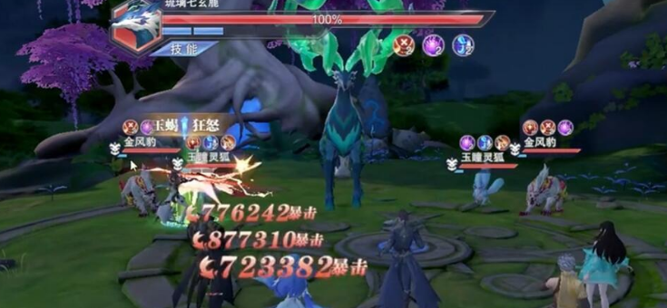战斗的节奏掌控非常重要,开局的前三回合,最好先清除七玄鹿召唤的荆棘护卫。要知道,七玄鹿每次进入战斗时,都会召唤四只毒刺精英怪,而这些怪物的眩晕技能常常会打断治疗角色的操作。所以,团队的首要任务是尽快清理掉这些小怪,避免治疗中断。戴沐白的白虎破灭杀可以有效集火敌人,尽量保证小怪尽早清理掉。与此同时,马红俊也可以通过凤凰啸天击进行收割,确保精英怪尽快消失。