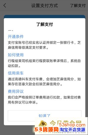 第六步:接上一步操作,查看说明后点击【知道了】后返回【设置支付方式】页面,点击【+】后进入到免密支付设置页面,点击确认开通即可完成设置。