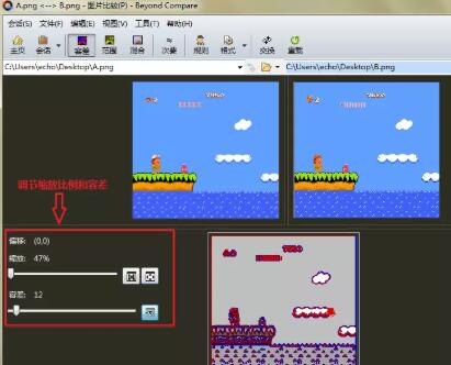 再次回到图片比较会话操作界面,需要比较的图片尺寸完全相同,可以进行匹配比较。可以滑动比较界面中“缩放”和“容差”的调节杆,选择合适的尺寸和像素查看图片差异部分。