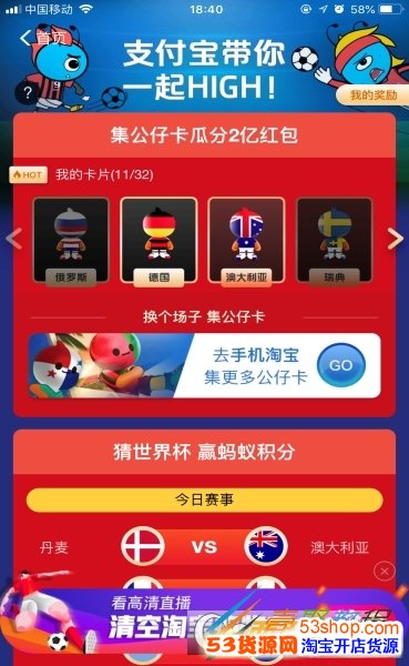 2018年6月12日-2018年7月18日期间,发行32张世界杯球队对应的淘公仔卡,有以下几种方式集淘公仔卡片: