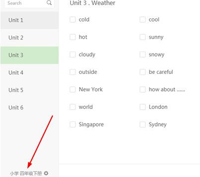 2、弹出听写界面,可以在左边选择单元,并在右边寻找此单元下的单词,若还不知道具体的单元,只需在上方的搜索框中输入你想要查找的单词;软件默认当前的教材为“小学英语三年级上册”,若想要更换学科或课本,只需点击左下角的设置选项即可,