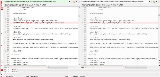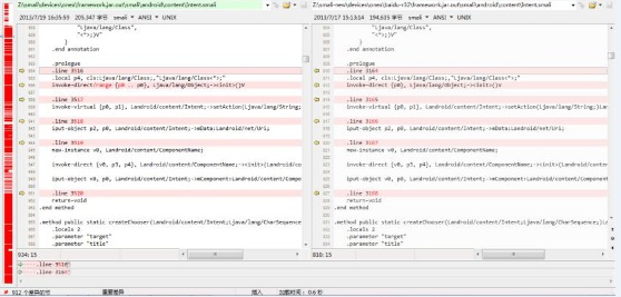 在对比smali代码过程,会发现很多文件的差异缩略图(见下图左侧)几乎全部标红,文件差异似乎很大。其实很多只是行号的差异,我们并不关心,但这些差异会让所关心的差异难以定位,因此可以设置一个对比规则忽略掉行号的差异,具体设置方法如下:
