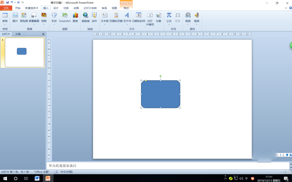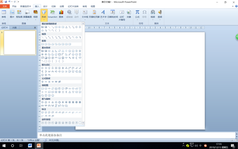 第一步:打开PPT2010,单击“插入”选项卡,在“插图”组中单击“形状”按钮。