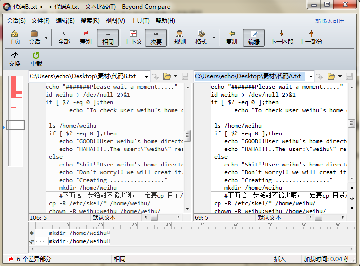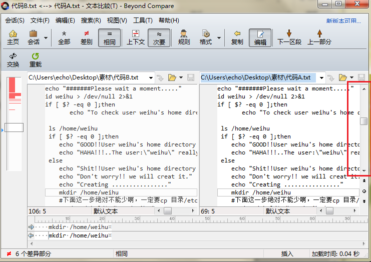 单击“确定”,关闭选项窗口,再次回到文本比较会话操作界面,如图所示,在文本比较会话窗格中显示出单一垂直滚动条。