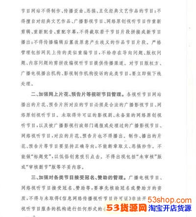 为进一步规范网络视听节目的传播秩序,维护健康清朗的网络空间,现要求:一、坚决禁止非法抓取、剪拼改编视听节目的行为;二、加强网上片花、预告片等视听节目管理;三、加强对各类节目接受冠名、赞助的管理;四、严格落实属地管理责任。