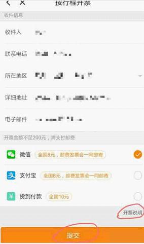 6、填写好发票详情和收件地址详情,因本次发票金额未达200元,滴滴会收取邮费,选择支付方式,点击“提交”按钮即完成操作,坐等发票快递到家。