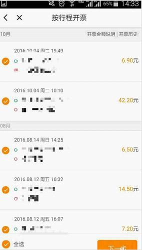 5、可以看到自己专快车的行程记录,点击左下角“全选”选项,点击“下一步”按钮。