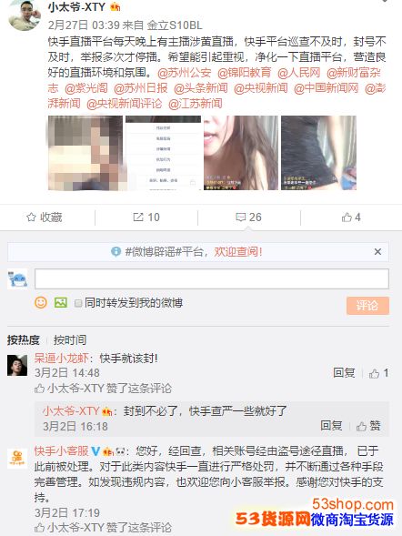 时间:2026-02-16 | 作者: | 阅读:0其中,一名微博名为@小太爷-XTY的用户在2月27日对快手涉黄进行了举报,“快手直播平台每天晚上有主播涉黄直播,快手平台巡查不及时,封号不及时,举报多次才停播。希望能引起重视,净化一下直播平台,营造良好的直播环境和氛围。