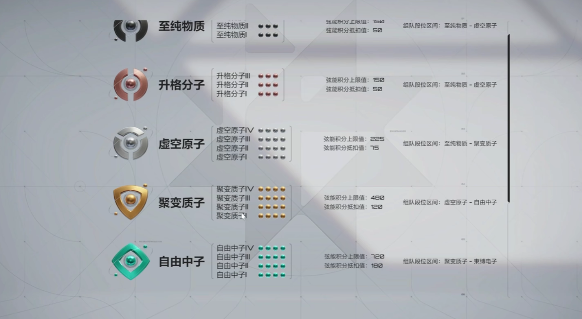 游戏内的段位划分的具体为:至纯物质、升格分子、虚空原子、聚变质子、自由中子、束缚电子、禁闭夸克、无限超弦、奇点?。