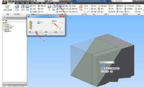 选择倒角——输入倒角边长——确定。消去长方体一角,零件基本成型。
