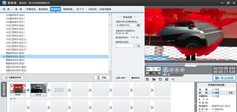 爱剪辑为素材加上柔边眼睛向外转场特效的相关方法