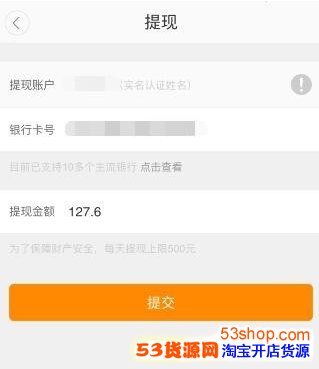 5.在提现页面无需输入姓名,因为实名认证过;必须每次输入银行卡号,支持国内多家主流银行,包括工商、建设、农业、招商、交通、中信、浦发、民生、平安等;输入金额,即可提取全部,也可提取部分;无误后点击下方‘’提交”按键即可;