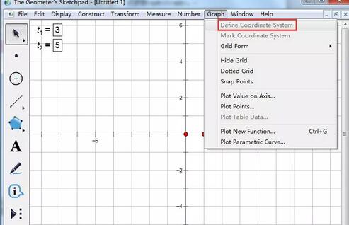 步骤二 建立坐标系。点击上方“绘图”菜单,然后在其下拉菜单选择“建立坐标系”命令,这样就可以在画板中建立好平面直角坐标系。