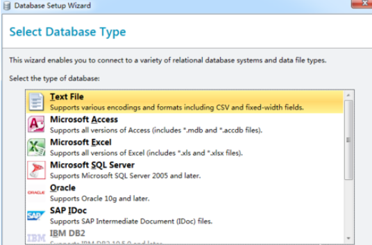 我们需要先打开BarTender软件,点击工具栏上“数据库连接设置“按钮,打开“连接数据库设置向导”对话框;点击第一个数据库类型“文本文档”,单击下一步Next;