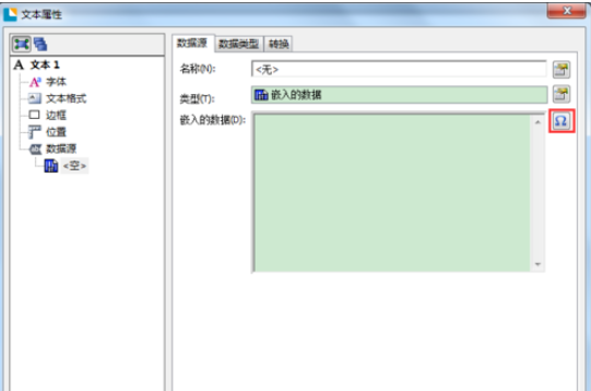 我们需要先在BarTender中,单击本文创建按钮,在标签中创建一个单行文本。双击文本,在数据源选项卡中单击“嵌入的数据源”后的按钮。