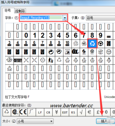然后我们在“插入符号或特殊字符”对话框中,字体选择“Seagull:Recycling v1.0”,然后选择所需的循环再生标志。单击插入,单击关闭即可。