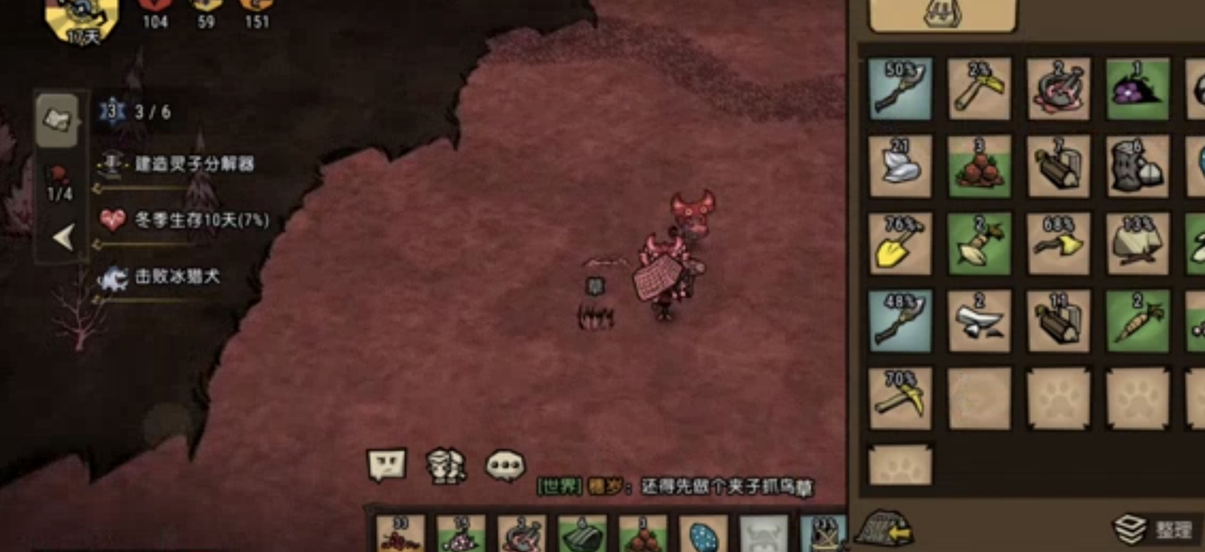 淡水为生存刚需,务必在早期确认稳定水源位置;椰子、树根等天然果实可缓解饥饿并辅助生命值维稳。当物资储备趋于充足,应立即升级背包容量,继而打造木甲增强防御、长矛提升战斗能力;铲子则用于开辟种植区,构建可持续食物供给体系。