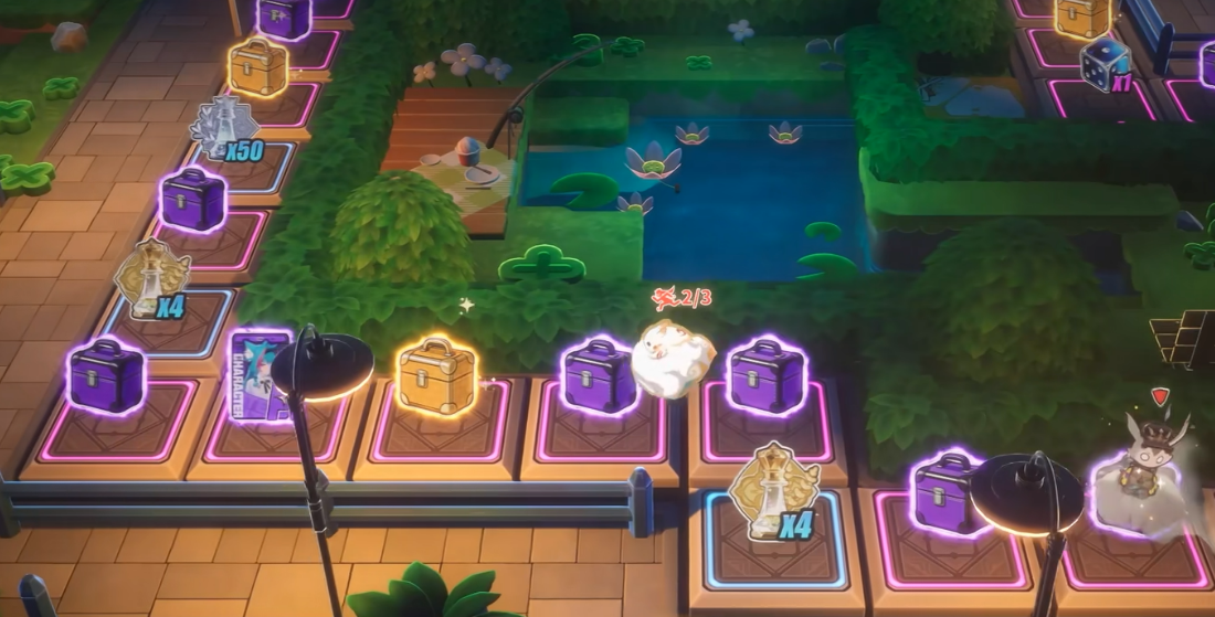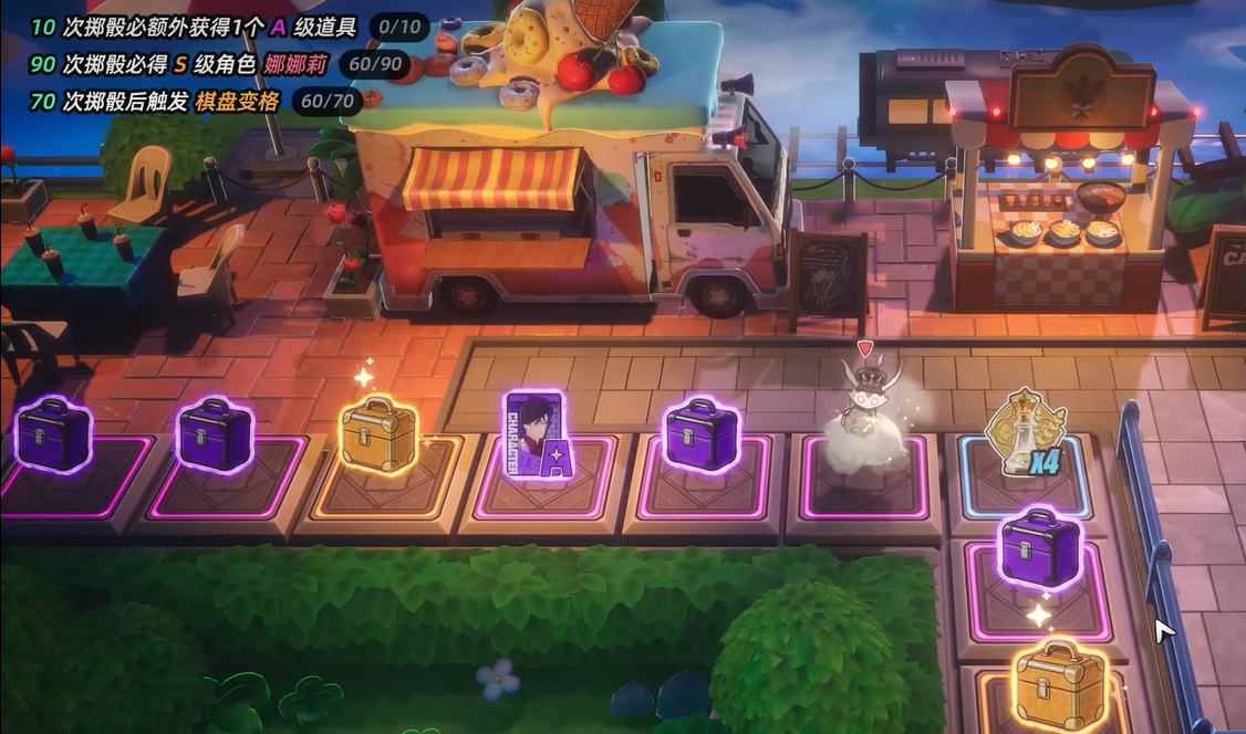 集市的核心玩法是棋盘形式的,玩家需要投掷骰子,骰子点数是多少,棋子就走多少步,最后落到哪个格子上,奖励就是那个格子对应的内容。格子分两种,一种是角色格,落上去就能直接拿到当期的UP角色,算是最直接的方式,另一种是宝箱格,这个就完全看运气了,有可能拿到S级角色,也有可能是S级武器,或者其他资源,总之宝箱格的结果不固定,踩上去之后才知道。