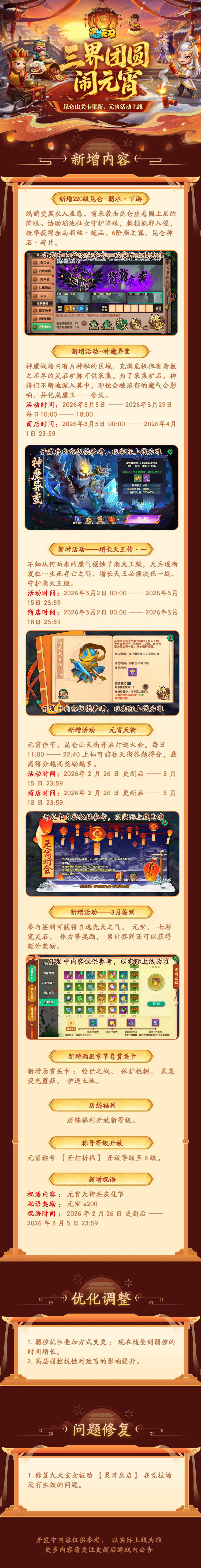 亲爱的上仙新年好!元宵将至,昆仑新关卡和新元宵活动即将上线,快来一起看看本周的更新公告吧~《造梦无双》将于2026年2月26日上午5:30~7:00停服更新,由此造成的不便,敬请各位上仙谅解。【更新范围】:所有区服【维护补偿】:元宝*200