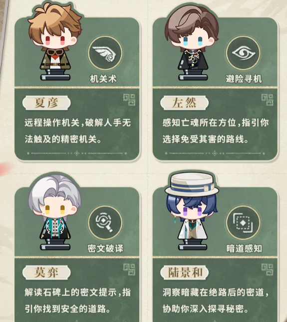 夏彦精通古代机关术,可隔空触发高危区域内的联动装置;左然具备亡魂感知力,能实时标示阴气聚集点,辅助规划安全行进路径;莫弈擅长古文字考据,可快速解析石刻、陶文、青铜铭文中的关键提示;陆景和拥有空间洞察天赋,可在看似封闭的环境中发现隐藏通道,拓展探索纵深。