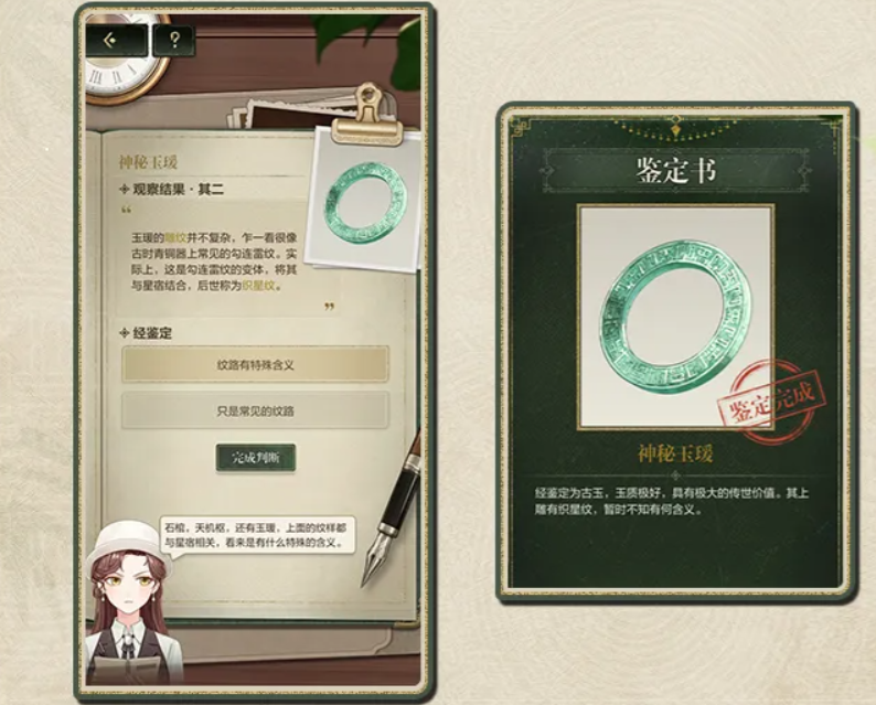 除主线调查外,“珍宝鉴定”环节要求玩家细致观察器物形制、纹饰、材质及保存状态,整合多方信息后填写标准化《珍宝鉴定书》,形成最终结论。在各阶段调查间隙,四位伙伴将分别发出独立委托邀请,玩家可自由选择同行对象,共同解锁对应角色视角下的古物叙事支线。