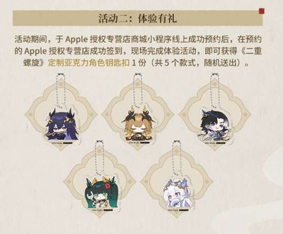 成功预约并在门店完成体验活动,即可获得定制亚克力角色钥匙扣1份(共5个款式随机送出),共计30万份,赠完即止。