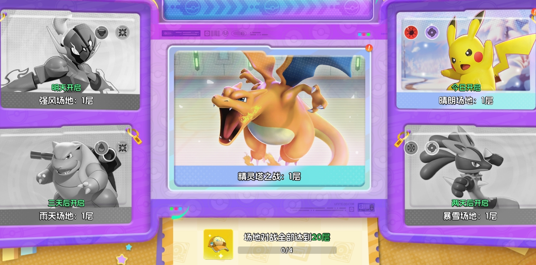 核心差异在于出战限制规则:“精灵塔之战”不限制阵营,全图鉴宝可梦均可自由编队;而“场地对决”则严格绑定当日开放的场地属性——例如晴朗场地仅允许晴阵营与幻阵营宝可梦登场。该模式每日仅开放一种场地类型,其余场地处于锁定状态,但所有已通关层数的进度永久保留,不会因场地轮换而清空或重置。