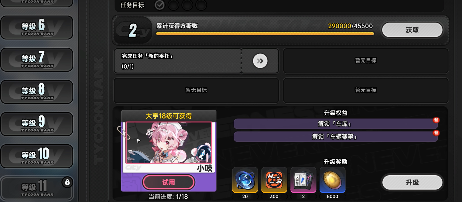 都市大亨共设45级成长体系,逐级解锁功能模块与奖励内容。当玩家达成满级(45级)时,可直接领取满阶小吱角色及专属配套武器。该奖励无需充值即可获取,对零氪及微氪用户具备明确的长期目标引导作用——相比常规途径需投入大量时间或资源兑换,该系统提供了更公平、更可预期的获取方式。