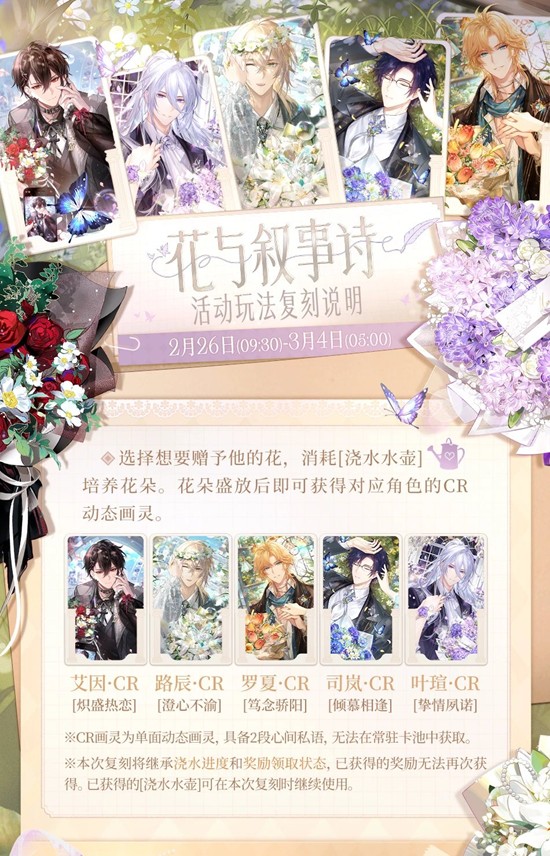 选择想要赠予他的花,消耗[浇水水壶]培养花朵。花朵盛放后即可获得对应角色的CR动态画灵。