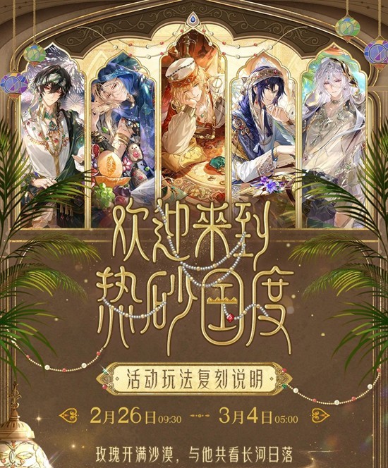 2月26日09:30 - 3月4日05:00,「花与叙事诗」「欢迎来到热砂国度」双活动返场,可通过[主界面]-[返场]进入并选择活动。