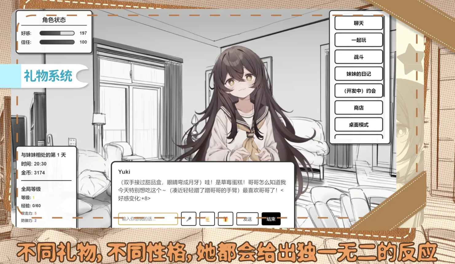 在《妹居物语》中,我们玩家将会在每天触发不同的剧情,这些情节将影响我们和妹妹之间的关系,或是增进和妹妹之间的关系,成为互相救赎互相治愈的温馨哥哥妹妹的关系,亦或者成为亦敌亦友的扭曲感情,又或者当信任度和好感度降到最低,触发游戏的隐藏剧情...游戏内容可以说是丰富多样,等待玩家前来探索。