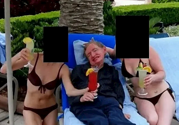 画面显示,霍金手持鸡尾酒杯躺在躺椅上,身旁有两名身穿比基尼的女子,其中一人协助其扶稳酒杯,另一人举杯互动。