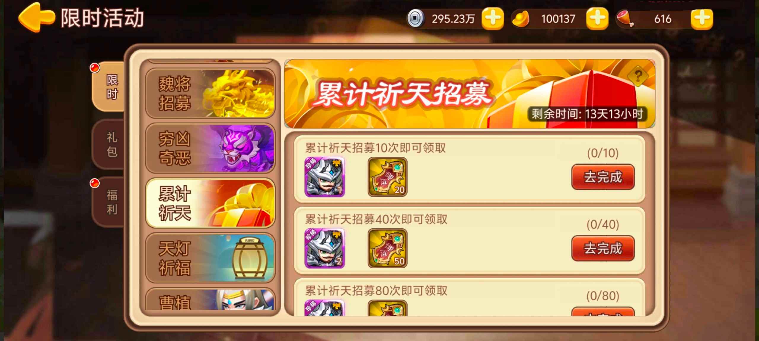活动内容:活动期间累积祈天达到次数,即可领取神将碎片等奖励。