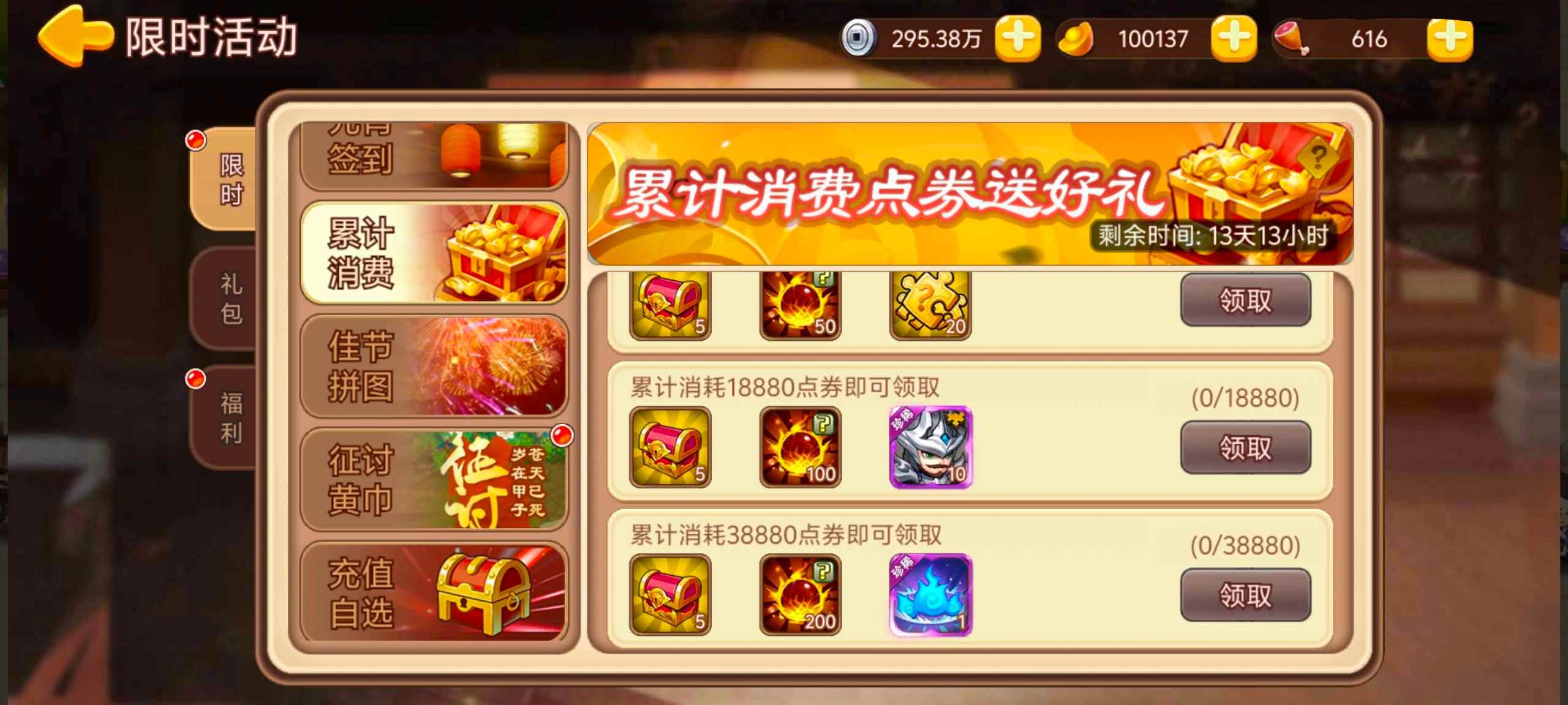累计消费38880点券:干将莫邪宝箱*5,高阶精髓自选*200,张辽·止啼元神*1