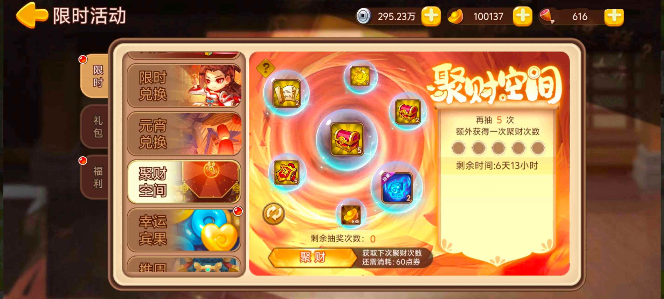活动内容:活动期间累计消耗点券可得聚财次数,消耗聚财次数即可进行抽奖。