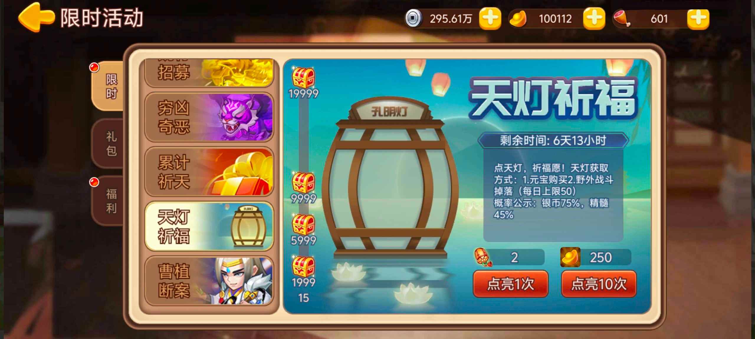 活动内容:活动期间点天灯积攒福愿领取奖励。天灯可通过战斗掉落或元宝购买获得。