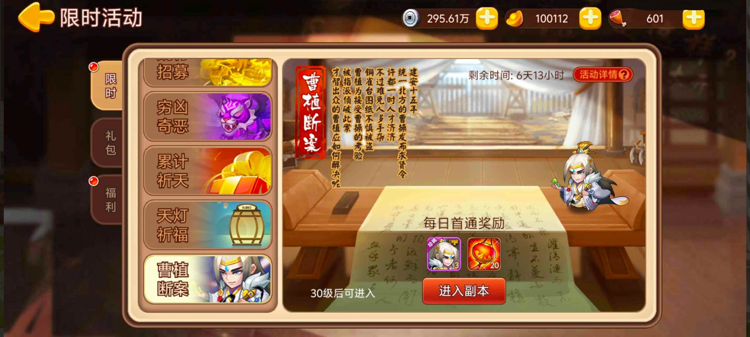 活动内容:活动期间开放“曹植断案”副本,每日首通获得奖励。