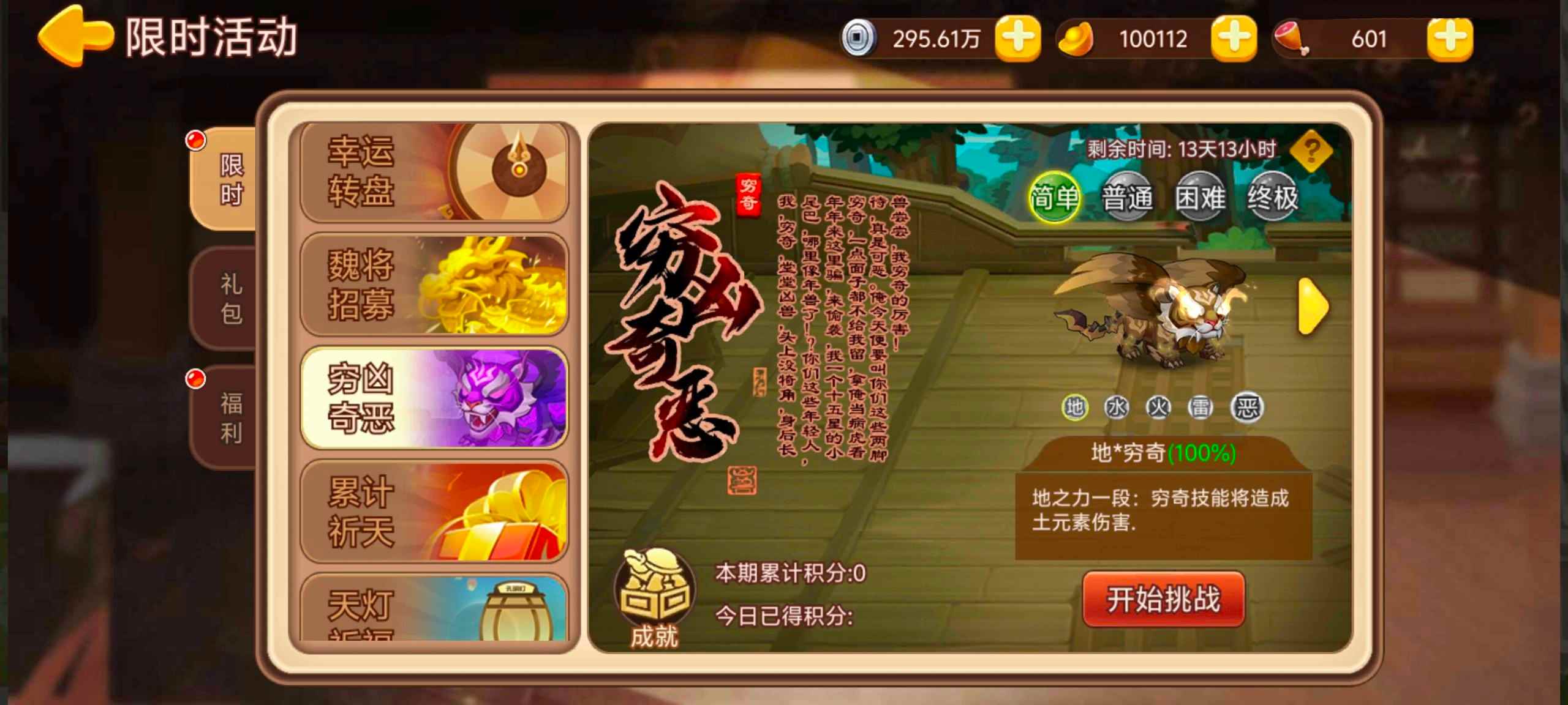 活动内容:活动期间开放穷凶奇恶关卡,战胜BOSS穷奇可以获得积分,累计积分可获得奖励。