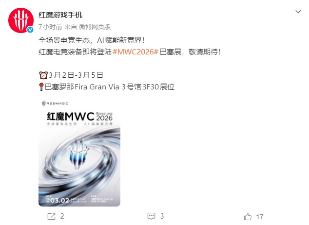 红魔官方同步发布的预热信息显示,MWC 2026巴塞罗那展将于3月2日至5日举办,红魔将在当地时间3月2日9:00(北京时间16:00)带来相关展示,围绕全场景电竞生态布局,结合AI技术为电竞体验带来新升级,这也是红魔在国际舞台上展现其电竞装备体系的重要动作。