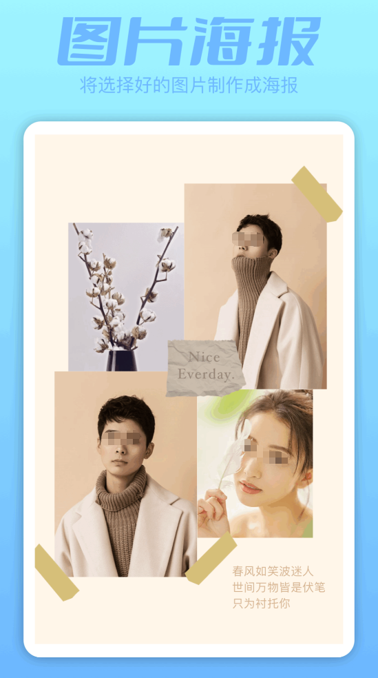 简单的照片拼接但是会显得很有质感,不管是工作还是情侣合照都可以用拼图的模式呈现,拼完图之后能对整体的框架、配色以及排版进行精细化的调整,看似简单的几步能做出视觉冲击性很强的内容,多种自定义功能让风格不再局限于上下两张的。