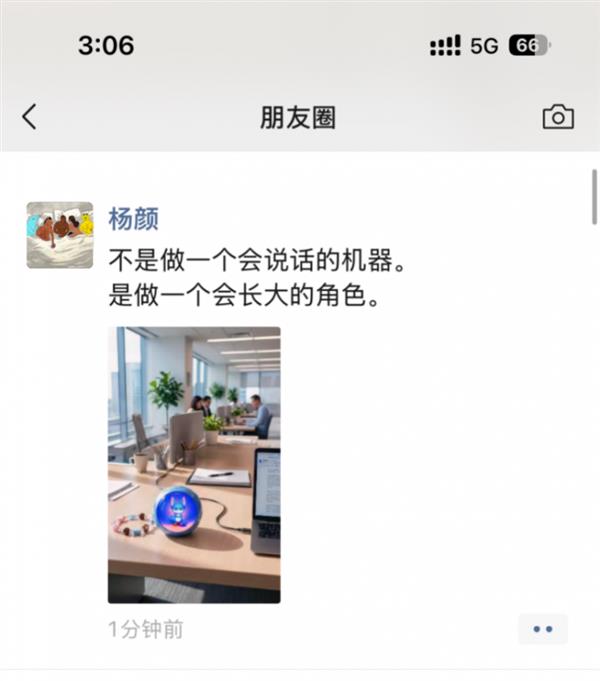 截图显示,杨颜发布了一条动态:“不是做一个会说话的机器。是做一个会长大的角色。”配图是一款圆形设备,中间显示一个蓝色卡通形象。