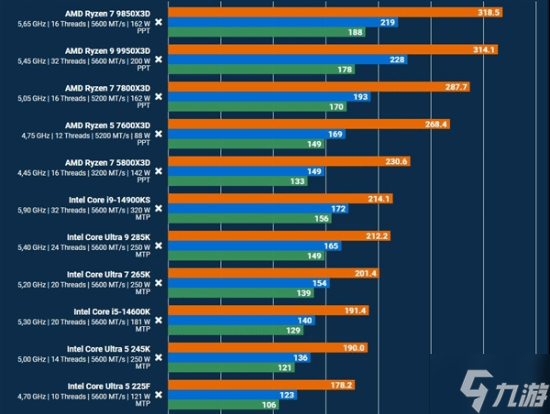 结果显示,在统一使用DDR5 5600MT/s内存的基准下,两者平均帧率上的差距竟然接近50%,9850X3D毫无争议地坐稳了游戏之王的宝座,前三甲被9850X3D、9950X3D与7800X3D包揽。