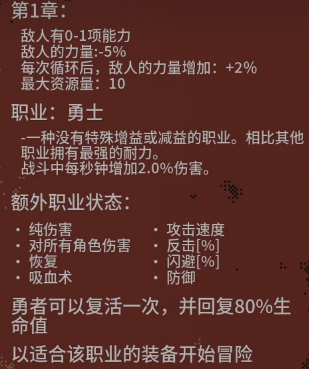 刚开始游戏只能用勇者这个角色,他没有什么特别厉害的技能,属性也都是最普通的,但是耐力值是所有角色里面最高的,还有一次被动复活,复活之后,能回80%的血量。对于刚开始玩的人来说,这个设计挺友好的,打死了还能再站起来,不会一下子就结束。