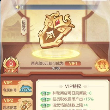 完成6元首充不仅触发元宝翻倍,还将同步解锁限定招募卡池——该卡池独立于常规招募系统,大幅提升赵云等核心武将的获取概率。同时,该笔充值直接激活VIP1身份,并授予“夜三国户籍”专属称号。随着VIP等级提升,后续可开放高级武将定向招募权限、个性化头像框及神秘商店每日额外8次刷新机会,持续强化资源获取效率与账号成长深度。