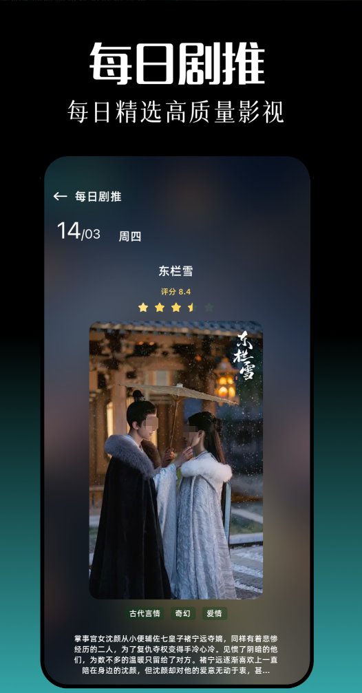 完整的追剧日记帮助你不漏更每一集,剧接上回流畅快速,除已完结的老剧之外,平台也有独立的版权日更新剧,还能设置好提前预约方法,在新剧开播或是新的一集播放前都会有独立的消息提示,在线的观众还能帮着你一起进行剧情的走向预测。