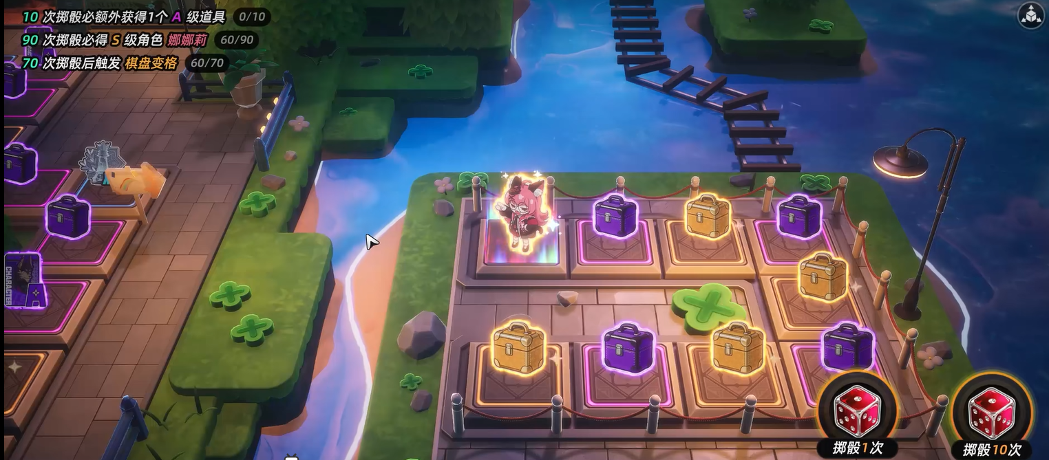 该玩法以环形棋盘为载体,玩家每次行动通过投掷骰子决定步数,棋子依点数沿路径移动,最终停留位置即对应奖励。棋盘格分为两类:角色格与宝箱格。角色格为当期UP限定角色专属格,落格即直接获得该角色,无概率干扰;宝箱格则为随机奖励区,可能开出S级角色、S级武器或通用培养材料,具体结果需落格后揭晓,不确定性较高。