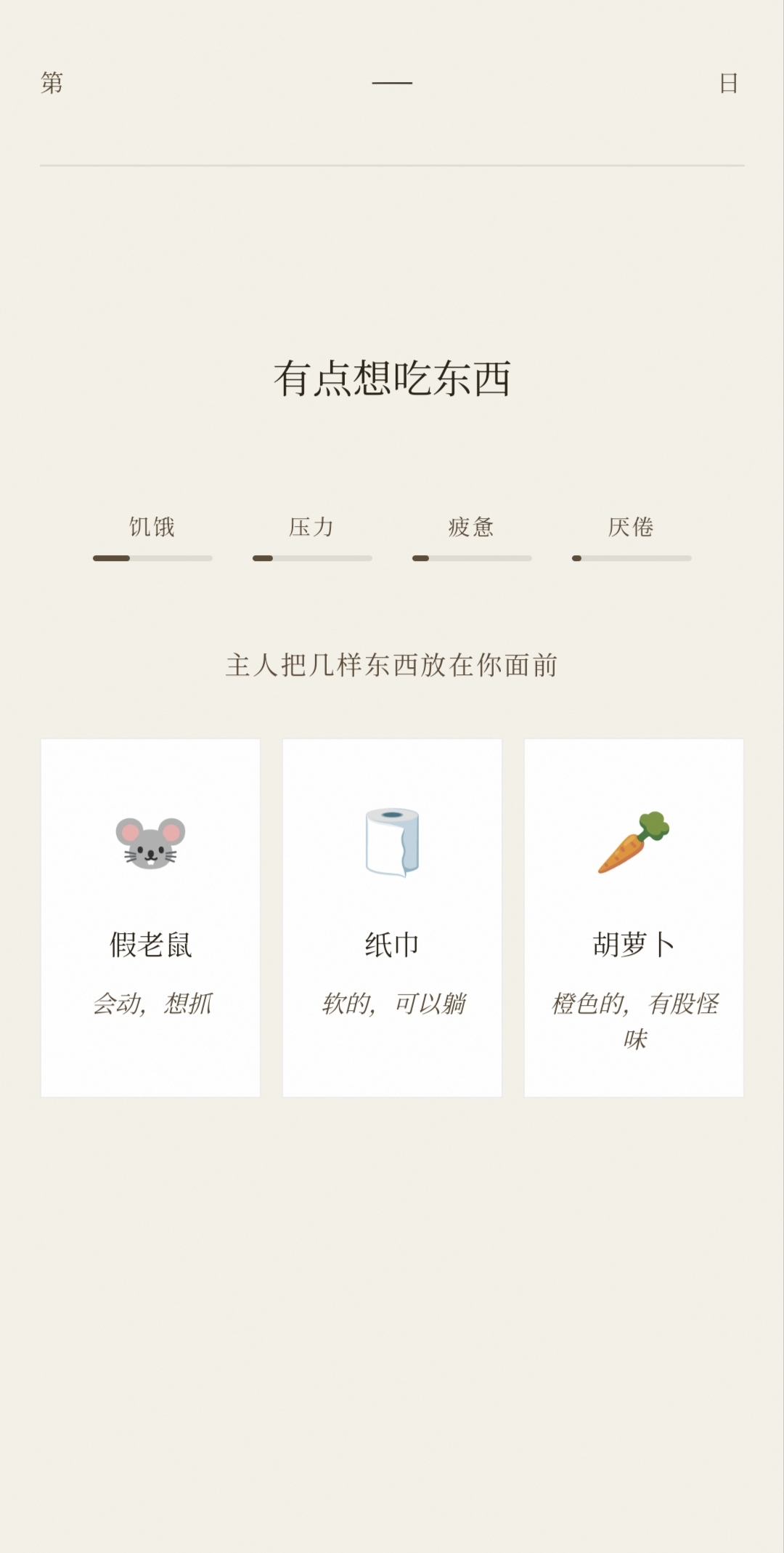 本作采用三维状态管理系统,涵盖饥饿值、厌倦值与劳累值(即压力值)三项核心数值指标: - 饥饿值:食用小鱼或萝卜可快速降低该数值;持续升高将导致角色体力衰竭并强制进入失败状态; - 厌倦值:接触萝卜、黄瓜等特定物品会加剧厌倦程度;使用纸箱、毛毯等休憩类道具可自主缓解; - 劳累值:选择镜子、红点等刺激性道具将显著提升压力水平;纸箱与毛毯同样具备减压功能。 三项数值若同时失衡且未及时干预,将直接削弱猫咪生命力,最终导致挑战终止。