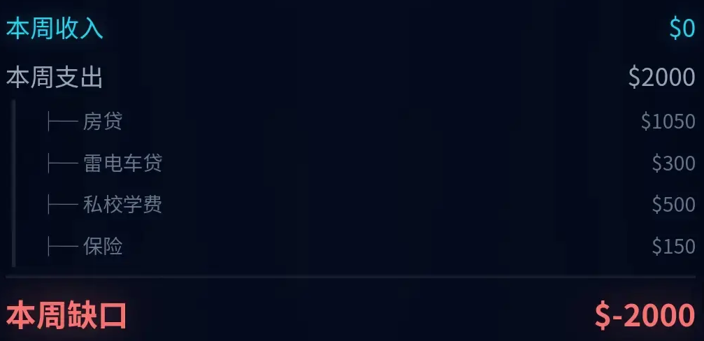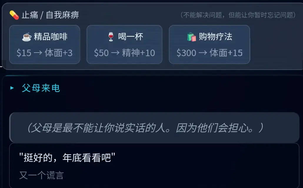 经济系统高度拟真,涵盖房贷、车贷、学费、保险、日常开销等多项刚性支出,资金缺口随剧情推进动态变化,真实映射当代都市青年的财务窘境。玩家需持续平衡收支、规避债务风险,并在有限资源中做出关键抉择。