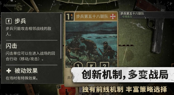 每回合开始的时候玩家可以抽取新的卡牌,增加指挥点数,并且可以根据战场的形势来做出相应的部署和指令,有哪一方的总防御值归零了就是游戏结束了。它里面有许多不同的卡牌类型,指令卡、步兵、坦克,还有指令卡、支援卡、事件卡等等。